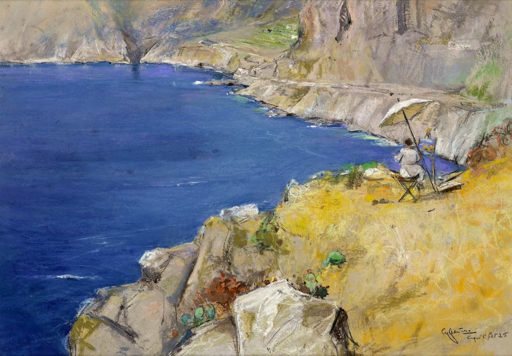 ‘Casciaro’s box of pastels is impossible to describe: a pinch of grey stones, uniform, small pieces no bigger than a bean; in that uniformity of ash, the tone of coral red or the intense blue of turquoise stood out. Casciaro, without looking for the colour, could feel it by touch, recognizing it by the shape of the pastel piece: he would sink his fingers into the box and, from all that grey, pull out, with certainty, the colour he needed. With the pads of his fingers, he kneaded, fused, and barely touched the surface of the painting, and not infrequently, he would strike it with the palm of his hand… Then, Siviero continues… once a work had been finished, he would move a few steps away from the place he was and, through a little rectangle of card, size up a new subject. With the dull and powdery material he handled, he was able to fully capture the crystalline transparency of the sky, the oily sheen of the sea, the glazed green of the pines, the solid compactness of the rock.’