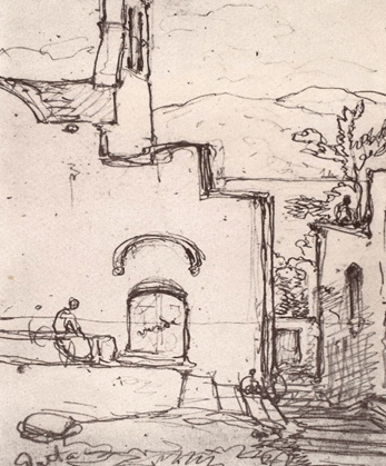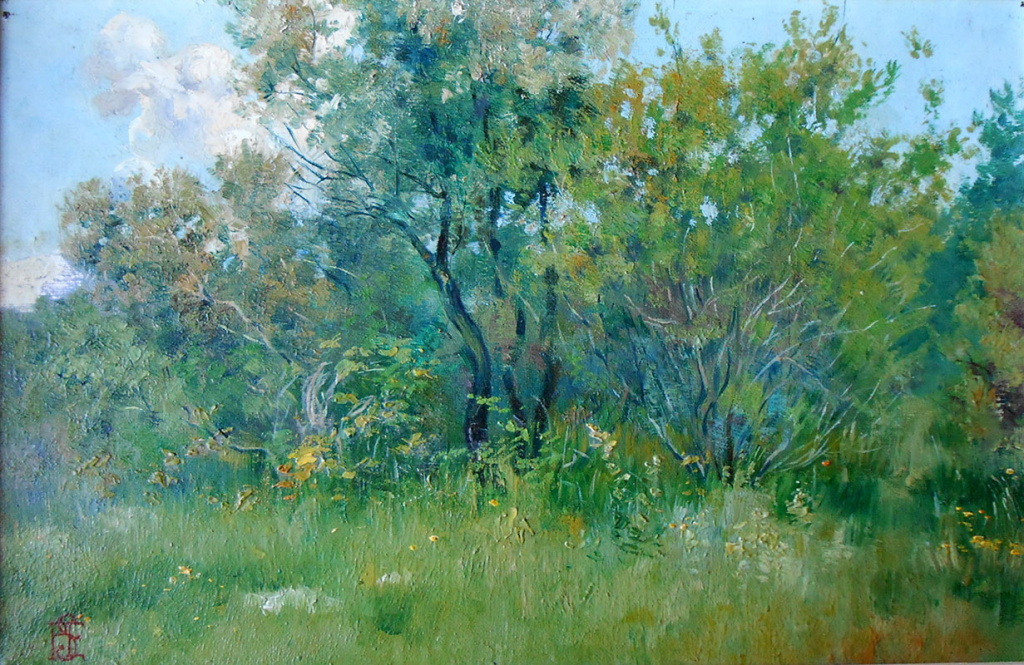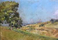 This study of Casoli (1895) offers us a pared down composition using a simple zig-zag of diagonal vectors. It is a study of nature that has just the suggestion of a solitary human presence, beneath a tree on the left. There is bright light coming from the left and creating strong shadows from the trees. The overall scene is peaceful with just a suggestion of human presence making a mark on the landscape – there is a quarry and what could be houses on the distant horizon. There are no intrusive ruptures from the landscape tradition and nature takes pride of place.