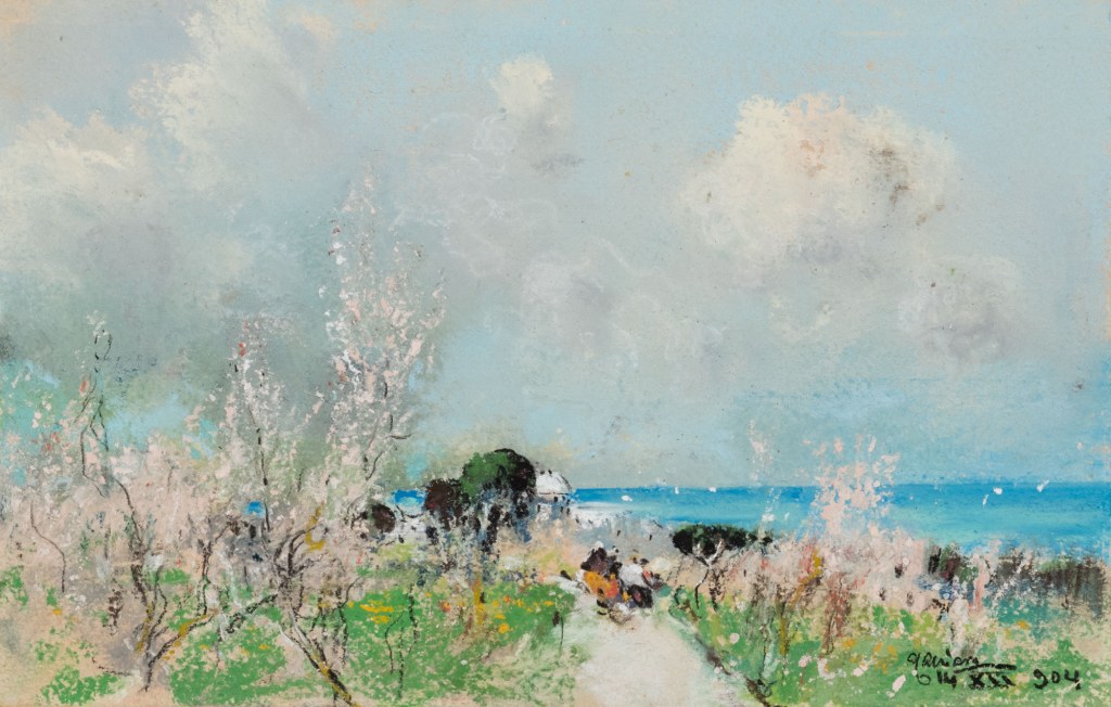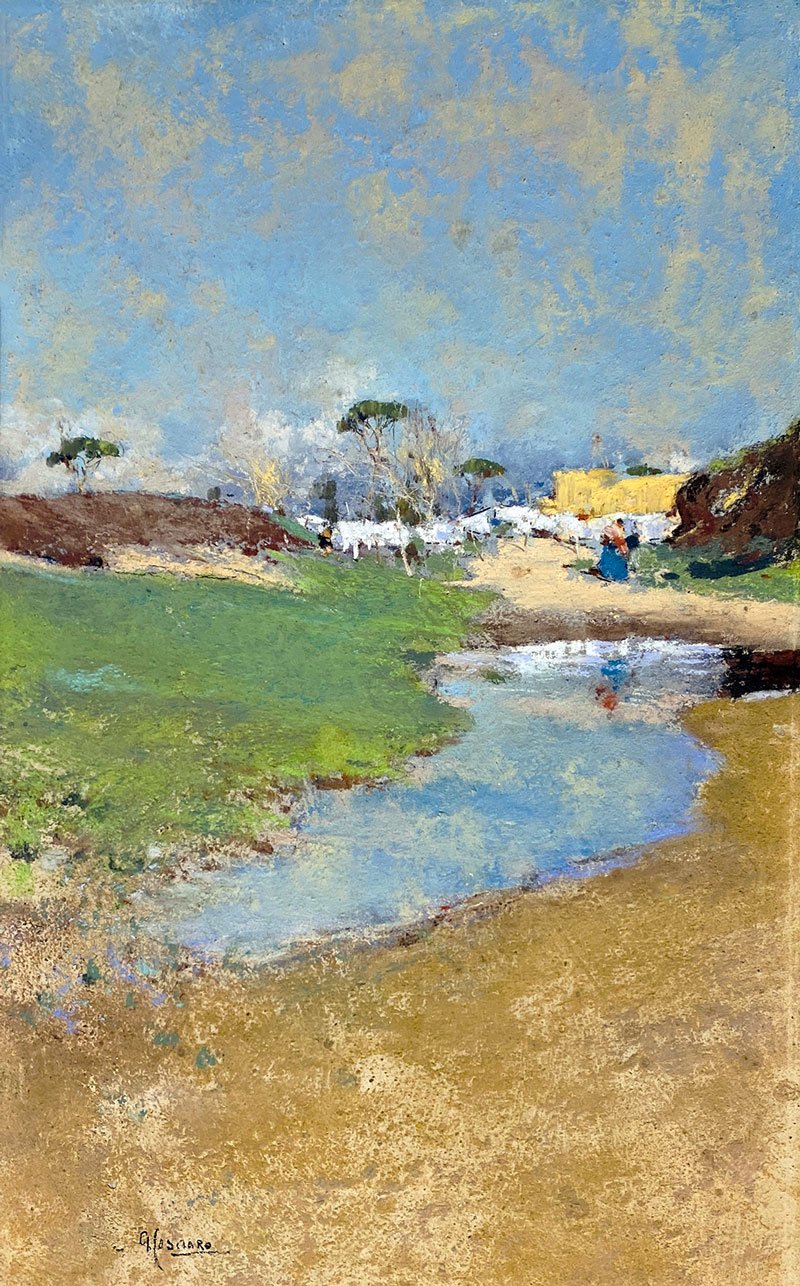There are themes that constantly reappear in the praise of his art. There are, for example, frequent comments on the luminosity of his works. They are seen as both real and true, as well as poetic and evocative. The variety of moods conveyed through his landscapes is seen to be wide ranging; from idyllic, bright and expansive, to introspective, melancholic and crepuscular. The elusive effect of his pastels on a viewer’s emotions is also suggested though comparison to music and poetry. (Casciaro had eight chalk medal portraits of major composers in his collection, which at least suggests that music may have, in fact, been important to him.) Beyond this, each study is often seen as a deeply personal work and Casciaro is often portrayed as a moral figure who is true to himself and who is industriously charting his own course. One of my favourite, and less formal, assessments of his talent comes from Antonio Mancini, who reportedly stated: