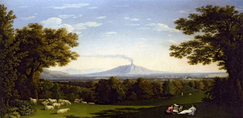 Jacob Philipp Hackert, Landscape with the Palace at Caserta and Vesuvius (1793). Museo Nacional Thyssen-Bornemisza, Madrid. Note the predominantly idealised and broadly symmetrical landscape with repoussoir trees that almost act like stage curtains.