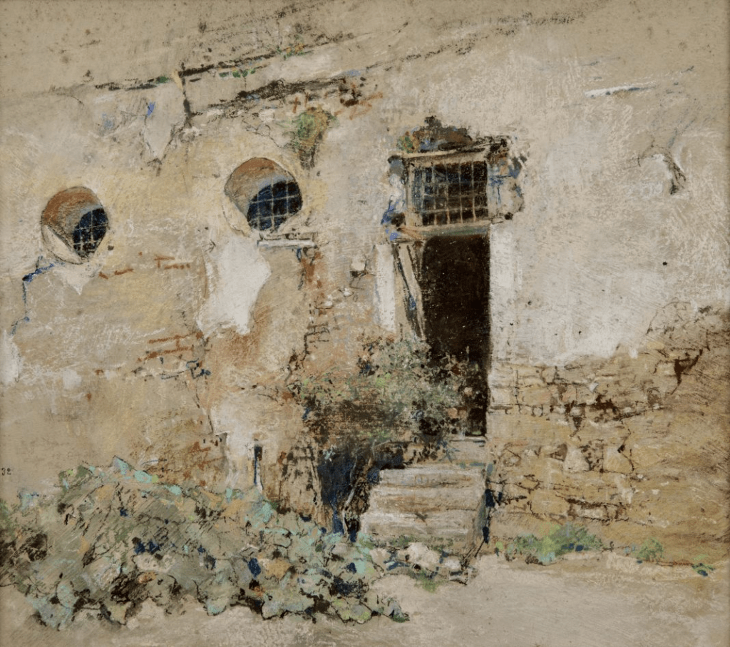 Casciaro’s use of white was highlighted by Bice Viallet in around 1917-1918 – Viallet considered them Casciaro’s ‘joy’ and noted various ways in which they were used. Faint, light and soft whites were used to capture snow and clouds, while a chalky and arid white would be used to capture the surfaces of walls and buildings as they reflected strong sunlight. Viallet cited the depiction of a church in Capri as an example of the latter. (See Carbonara, 2022).
