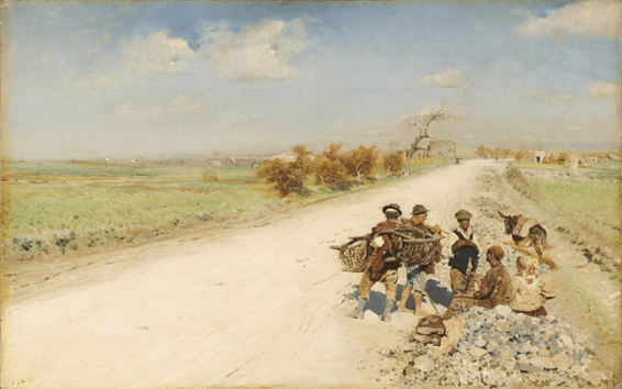 Earlier, his Sur la route de Castellamare/ On the Road to Castellamare (1875) depicts a similarly popular scene, composed around a road, as in the more famous works The Road to Brindisi and Crossing the Apennines. The painting captures an intensely hot day, showing sunburned workers pausing from their labour: one eats grapes while another has removed his workboots. The baskets carried by the man on the left will soon be loaded onto the nearby donkey and filled with stones. While these figures are clearly labourers exposed to some hardship, De Nittis does not present them as exhausted, vulnerable, or exploited.