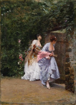 However, the narrative ambiguity of the scene feels distinctly modern. Set in a threshold space, the painting shows elegant but undefined women looking back through a garden gateway, suggesting the moment after a social event. While they appear cognisant of some shared activity, its nature remains unclear; and although they represent the height of elegance, their faces are withheld from view.