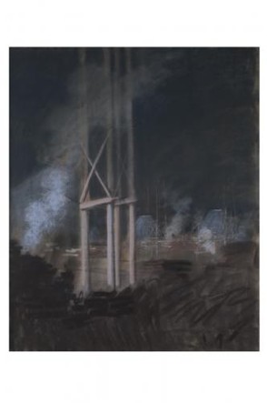 The softness of the pastel destabilises the hard industrial structures, as does the evening register, which renders the austerity of the image mysterious rather than merely severe. Devoid of any element of the picturesque, this is a work of stillness, mystery and modernity.