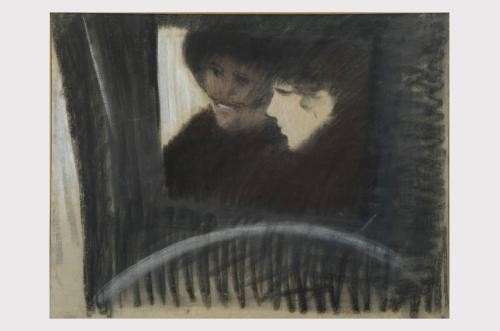 In this work, De Nittis attends to the most fleeting of gestures. We catch a glimpse of two women through the window of their cab. The half-smile of the more distant figure might suggest a momentary response to something just said; in any case, we are looking into a private space, as if by accident.