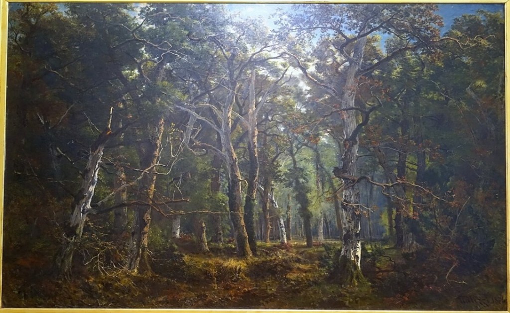 Gabriele Smargiassi: Paesaggio napoletano/ Neapolitan Landscape (1830), 30 x 40 cm, Private collection and Giuseppe Palizzi: Bosco di Fontainebleau/Forest of Fontainebleau (1874),oil on canvas, 232×320 cm, GNAM, Roma.