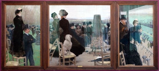 Alle Course de Auteil (At the Races of Auteil) 1881, our second large pastel work, is a secular triptych of modern life in Paris. This combination of three segments of racecourse life simultaneously offers three studies in intensely photographic framing, as well as some radical viewpoints from different levels and locations. It is not the sport that is depicted here but the see-and-be-seen culture of the haute bourgeoisie engaging in a leisure activity. Their elegant attire, with fine coats, hats, and dresses, reinforces the sense of display and social distinction. The composition suggests a bright autumn day, with the light and atmosphere conveying a crisp, seasonal quality.