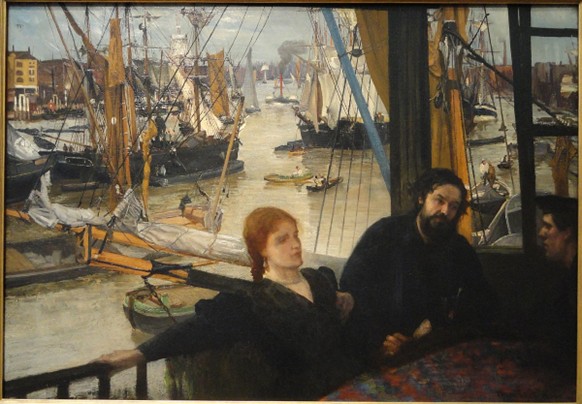 There is something inherently mesmerising about the prospect of a dining scene at the water’s edge. A similar contrast between close company and open water is captured in Whistler’s Wapping (1860–1864), which features the artist’s model and partner Joanna Hiffernan reclining on the balcony rail of a Thames-side pub, the Angel, in Cherry Gardens, Bermondsey. The scene here is more urban and socially realistic: we are in the working-class docklands of the Thames rather than the gulf of Naples. Yet both works seem to function as existential tableaux, placing human interaction at the edge of an open expanse of water.
